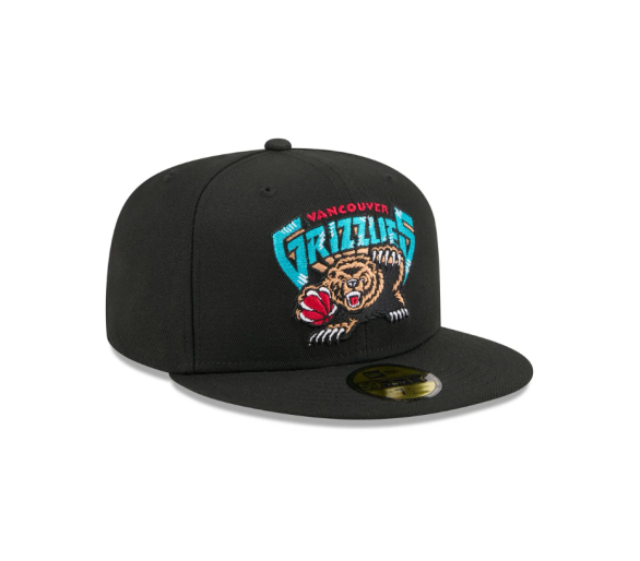 La casquette ajustée Vancouver Grizzlies 1995-2001 Hardwood Classics 59FIFTY présente un logo vintage brodé des Grizzlies sur les panneaux avant, le logo NBA à l'arrière et une visière inférieure grise.