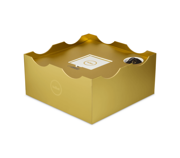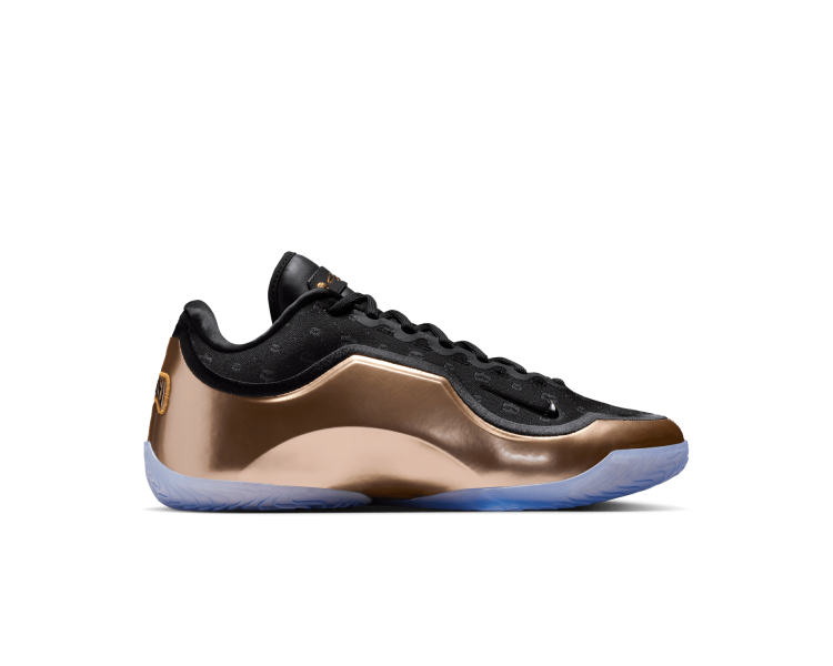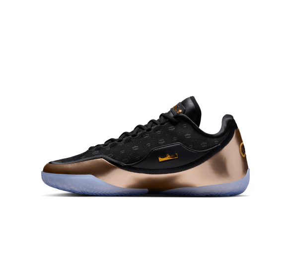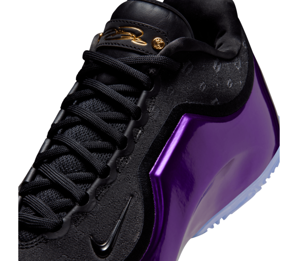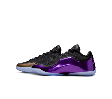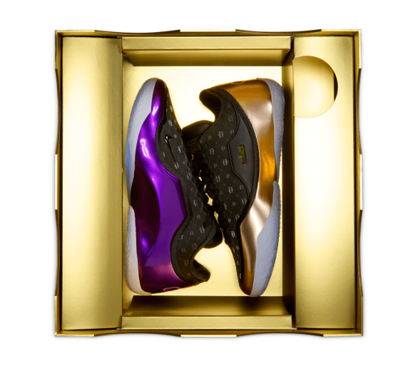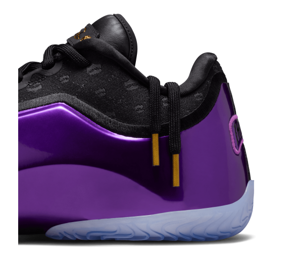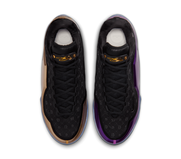 La chaussure droite est entièrement dédiée à LeBron, avec sa signature dorée et son icône « Chosen 1 » au talon, clin d'œil à sa carrière légendaire. La chaussure gauche noire et violette rend hommage à Bronny avec son propre autocollant « 1 Who Chose » au talon, symbolisant son parcours personnel. Le motif de la tige des deux chaussures est un mélange de grandes couronnes (salut du règne de LeBron) et de petites couronnes (symbolisant la promesse de Bronny).