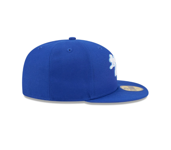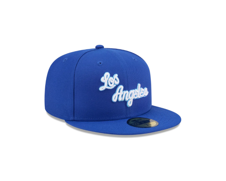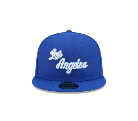 La casquette ajustée Los Angeles Lakers 1960-1965 Hardwood Classics 59FIFTY présente un logo vintage brodé des Lakers sur les panneaux avant, le logo NBA Logoman à l'arrière et une visière inférieure grise.