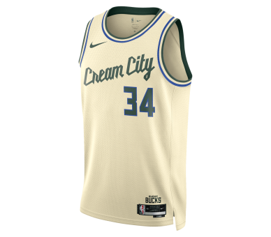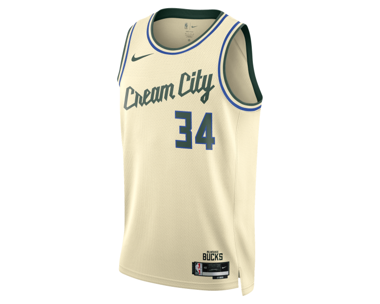Le design emblématique et best-seller de la City Edition des Bucks fait son grand retour, accompagné d'un terrain assorti personnalisé. La couleur crème de l'uniforme City Edition 2025-26 rend hommage aux briques qui ont bâti les fondations de Milwaukee et inspiré son surnom de « Cream City ». Les rayures vertes et bleues ainsi que la police d'écriture manuscrite des Bucks célèbrent l'histoire de l'équipe tout en apportant une touche de modernité au design.